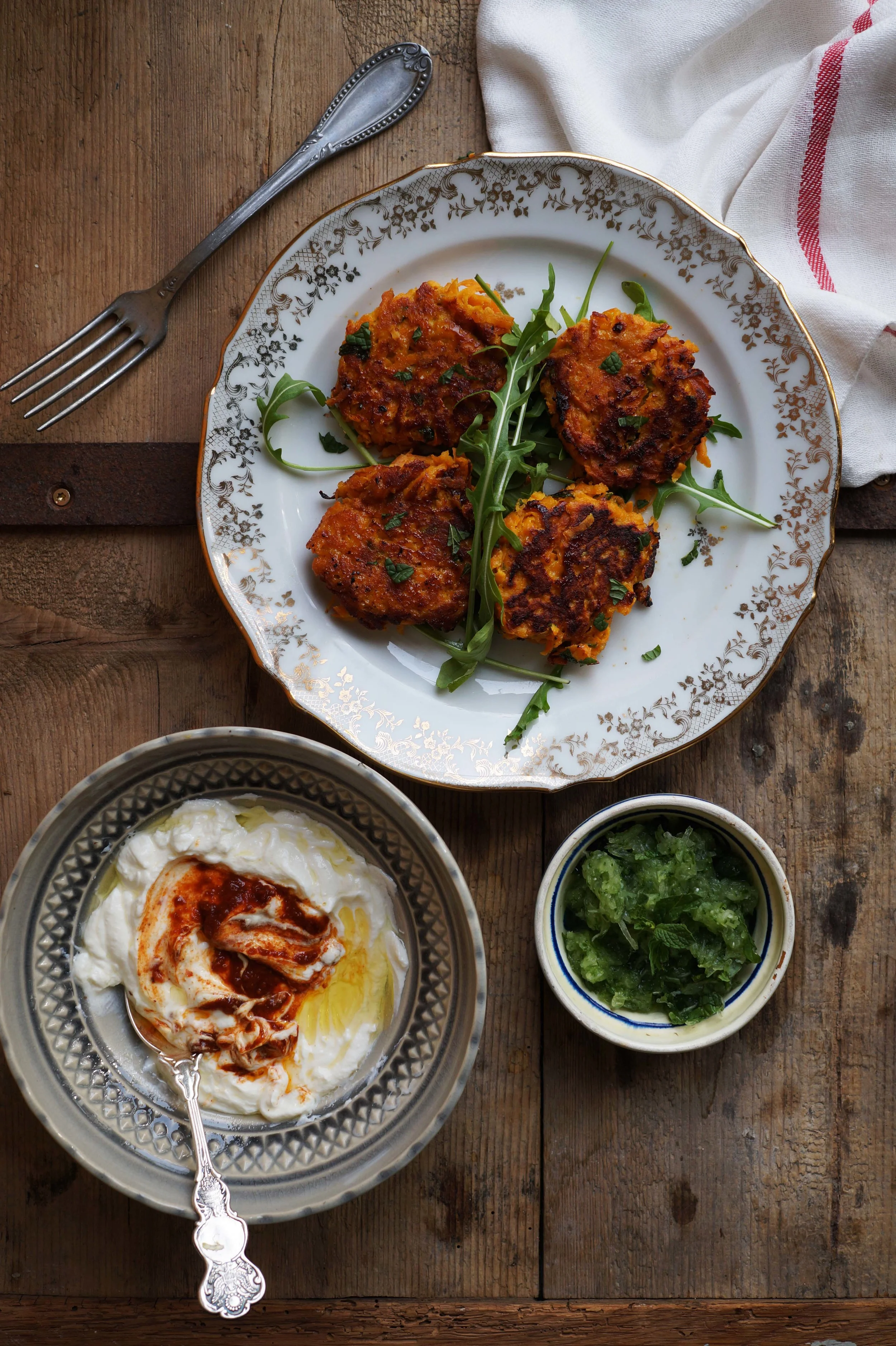 Zoete aardappelkoekjes met harrisayoghurt & komkommer